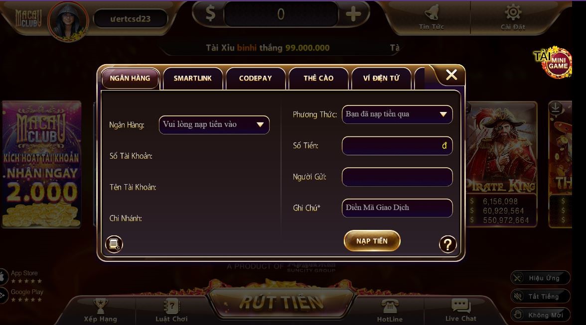 Hướng dẫn nạp tiền qua thẻ ngân hàng tại Macau Club