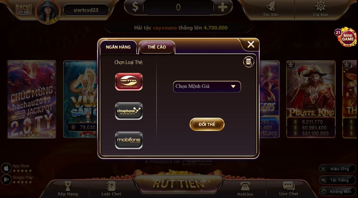 Hướng dẫn rút tiền qua thẻ cào tại Macau Club