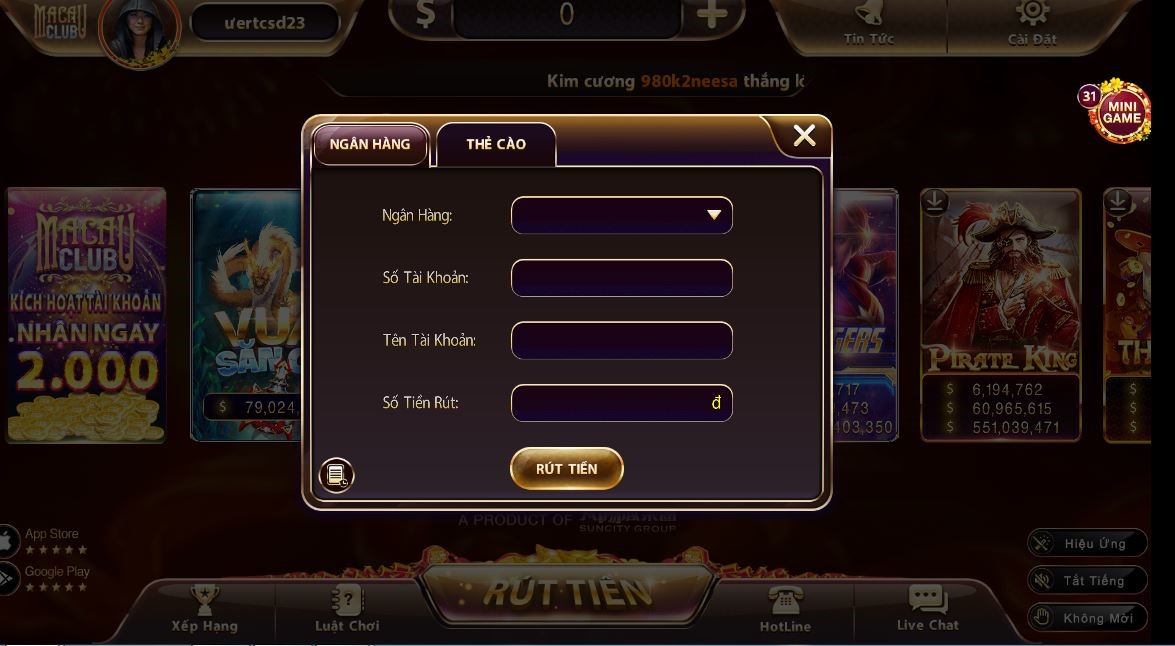 • Bước 2: Chọn vào nút RÚT TIỀN ở giữa dưới giao diện của cổng game