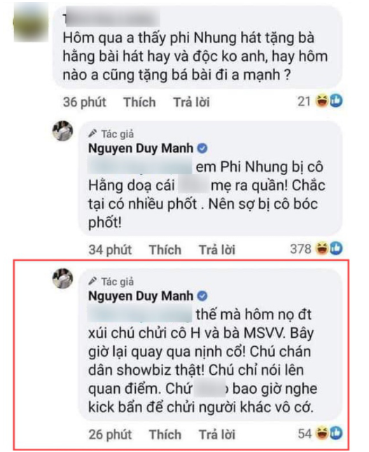 Khi có một người nhắc đến vụ Phi Nhung đăng clip hát tặng bà Phương Hằng, Duy Mạnh được cho là đáp lại bằng từ ngữ thô tục “Em Phi Nhung bị cô Hằng dọa cái *** ra quần. Chắc có nhiều phốt nên sợ cô bóc phốt”.