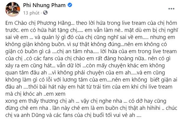 Trên trang mạng xã hội facebook của ca sĩ Phi Nhung gửi bà Phương Hằng liên tục cho biết “không buồn, không giận”.